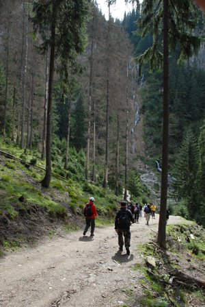 Jadąc nad narciarską trasą zjazdową podziwialiśmy kolejne widoki, które odsłaniały się przed nami wraz z wspinającymi się w górę krzesełkami. Drogą od wyciągu udaliśmy się pod wodospady (kaskady) Case Cailor, które mają ok 90m spadku – widok wart zobaczenia. Następnie żmudna i ostra wspinaczka na Polanę Stiol (1572m). W drodze pod górę, „zaliczyliśmy” ze Zbyniem niewielką jaskinię w ścianie skalnej, wyglądającą bardziej na wykutą niż naturalną. Po odpoczynku na polanie ruszyliśmy w kierunku przełęczy Sauna Gargalau. W drodze minęliśmy wielkie stado owiec i kóz prowadzonych przez pasterzy w przeciwnym kierunku. Stojąc na skałce pośrodku stada czuliśmy się jak okręt na morzu. Na lewo od naszej drogi odbijając słońce pyszniło się jezioro Izvoru Bistriei. Z przełęczy Sauna Gargalau (1907m) po długich dyskusjach i rozważaniach ruszyliśmy w kierunku ruin schroniska Puzdrele przekraczając następną przełęcz Saua Galatului (1882m). Oznakowanie szlaków do tej pory było jako takie, ale teraz trzeba było uważać na każdym kroku, aby z niego nie zejść. Brak tu tabliczek z kolorem szlaku, czy też wyraźnie wydeptanej ścieżki. Jedyne na co można liczyć to na czytanie mapy i wypłowiałe znaki na kamieniach, o ile takie znajdują się przy szlaku. Doszliśmy jednak do schroniska Puzdrele, często idąc prawidłowo tylko dzięki dokładnemu czytaniu mapy przez Piotra Ż.